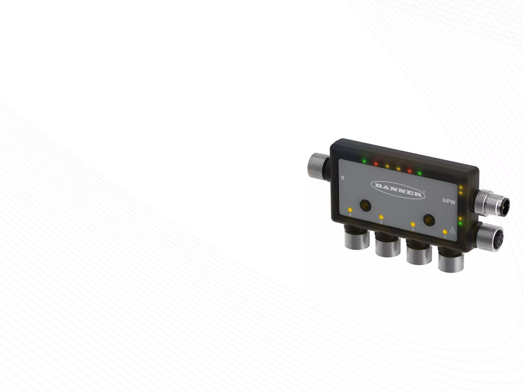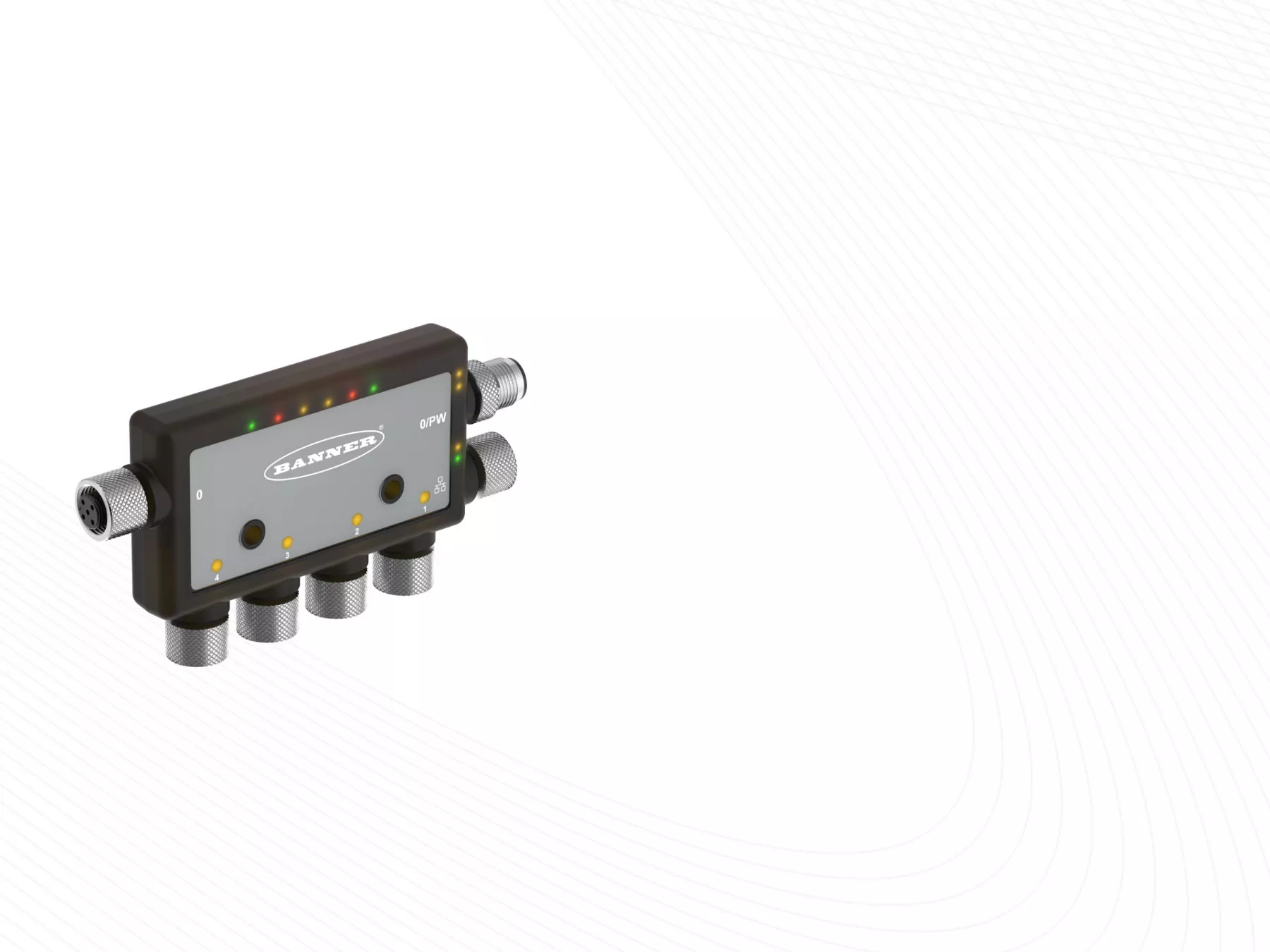 The DXMR90 features four female M12 ports, which can receive native Modbus signals and an ever-expanding variety of legacy electronic signal types converted to Modbus using other Snap Signal products. These ports can also connect to Banner radios to receive signals wirelessly—even at distances of up to six miles. Each port can be configured as its own Modbus Client, with selectable baud rate and parity settings, for a series of connected device signals. The DXMR90 also features an M12 D-coded Ethernet connection port for communicating over Modbus TCP, Ethernet/IP, and Profinet, or for controller configuration.